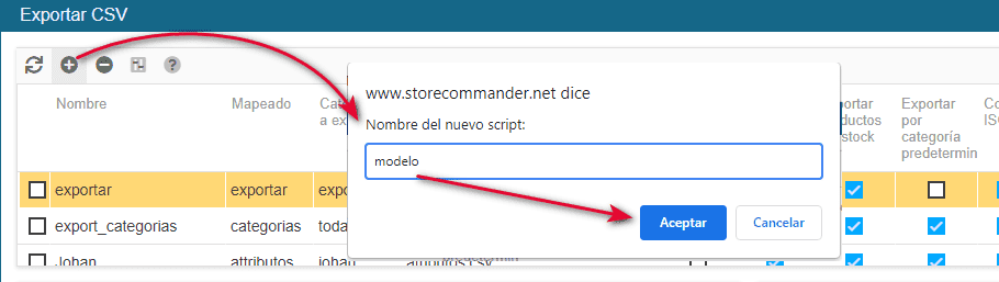 - Cree un script haciendo clic en y dele un nombre a su exportación