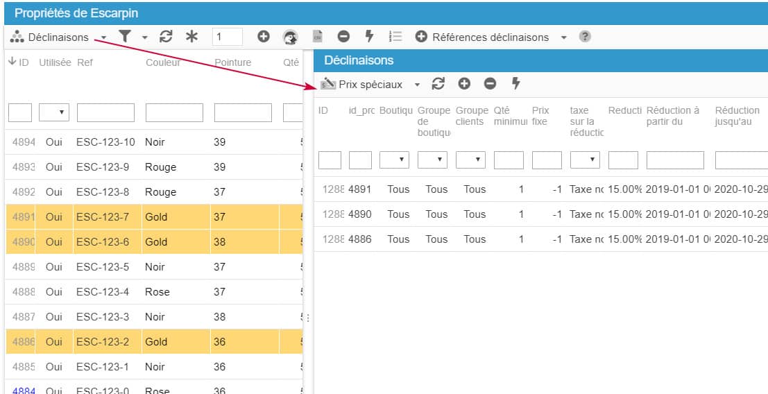 Si vous souhaitez mettre en place un prix réduit sur une déclinaison spécifique, cela est possible en utilisant la grille Prix Spéciaux qui se trouve dans la grille des déclinaisons.
