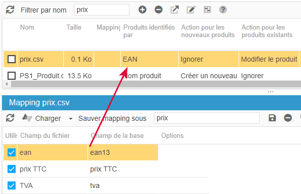 - l'identifiant du produit, c'est à dire le nom du produit, son ID, sa référence ou encore son code EAN13. L'important est que cet identifiant soit unique sur chaque produit (pas de doublon).
