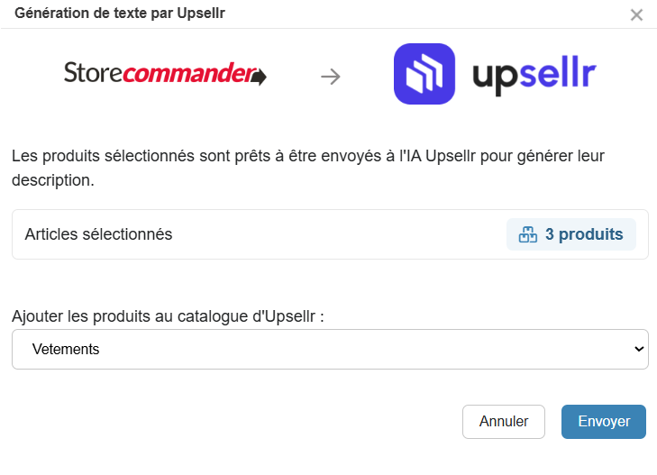La fonctionnalité Upsellr intégrée à votre Store Commander permet de facilement et rapidement envoyer vos produits vers l'agent ID d'Upsellr afin d'enrichir leur contenu.