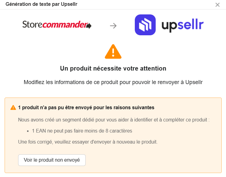 A ce moment-là, un message s'affichera et un segment sera créé automatiquement contenant les produits concernés pour que vous puissiez corriger rapidement avant de les renvoyer vers Upsellr.